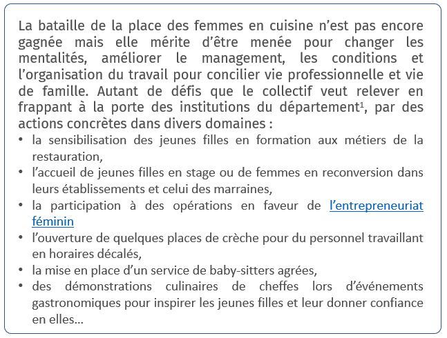 2 % seulement de femmes parviennent à des postes de chef en restauration ! Moins de 5 % des chefs étoilés du Guide Michelin sont des femmes et cinq restauratrices seulement ont décroché trois étoiles… Ariane Daguin, Hélène Darroze et Anne-Sophie Pic, cheffes d’entreprise reconnues du secteur de la restauration, font figure d’exception. Et le temps des mères lyonnaises, Richard, Blanc ou Brazier qui, au passage, a formé un certain Paul Bocuse, ce temps de l’avant-guerre où les femmes tenaient le haut du pavé en cuisine (restauratrices multi-étoilées), parait bien lointain…