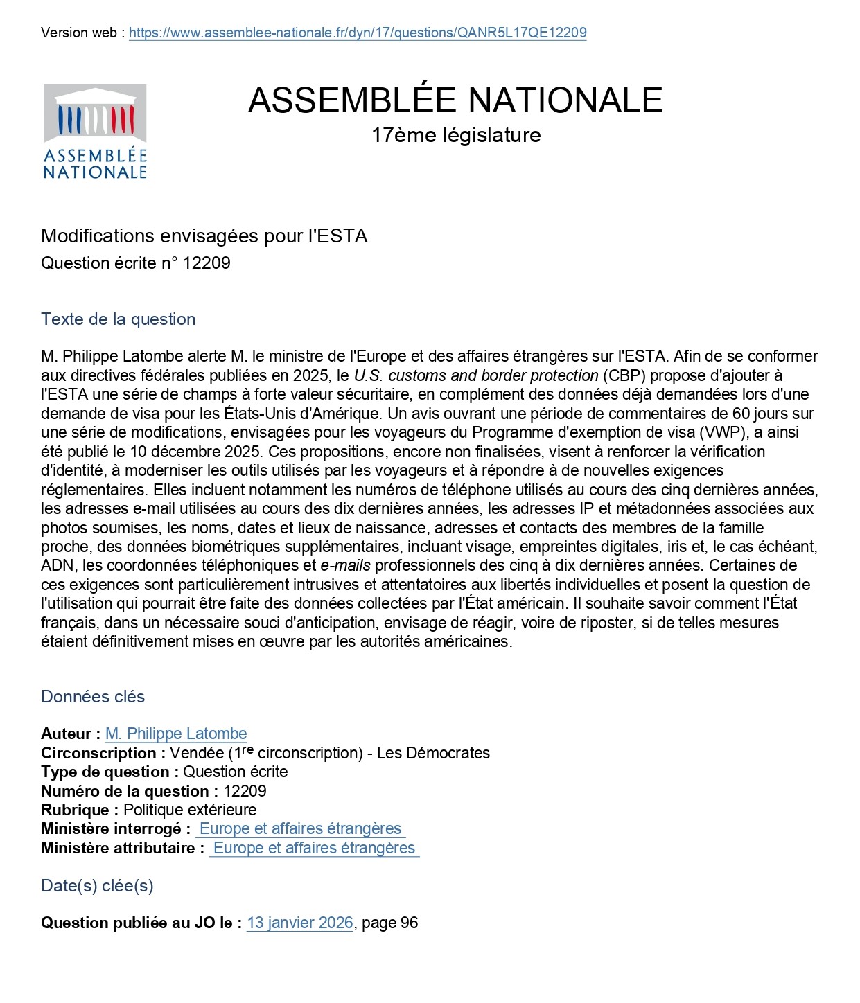 Le député Philippe Latombe alerte le ministre de l'Europe et des affaires étrangères -
