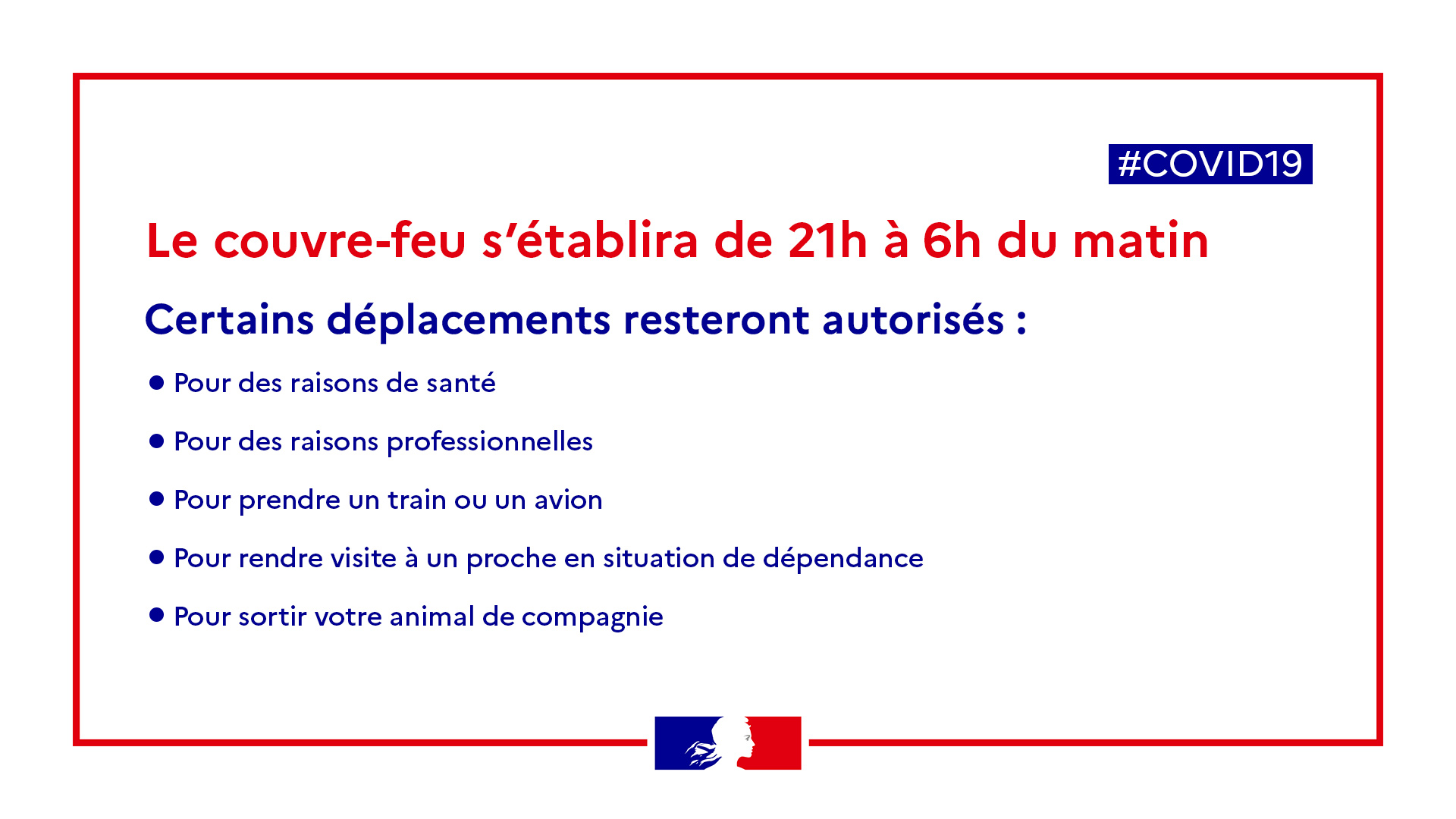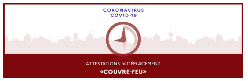 Couvre-feu : En application du décret du 16 octobre 2020, les déplacements de personnes sont interdits hors de leur lieu de résidence entre 21h00 et 6h00 tous les jours de la semaine, à l’exception des motifs suivants :