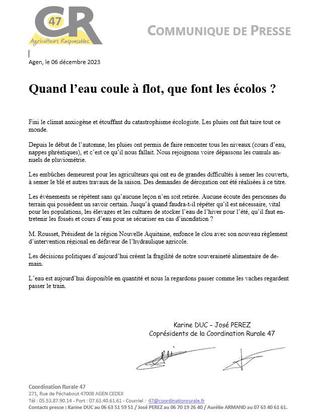 M. Rousset, Président de la région Nouvelle Aquitaine, enfonce le clou avec son nouveau règlement d’intervention régional en défaveur de l’hydraulique agricole.