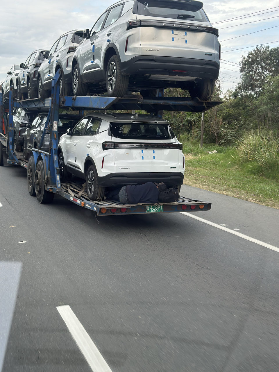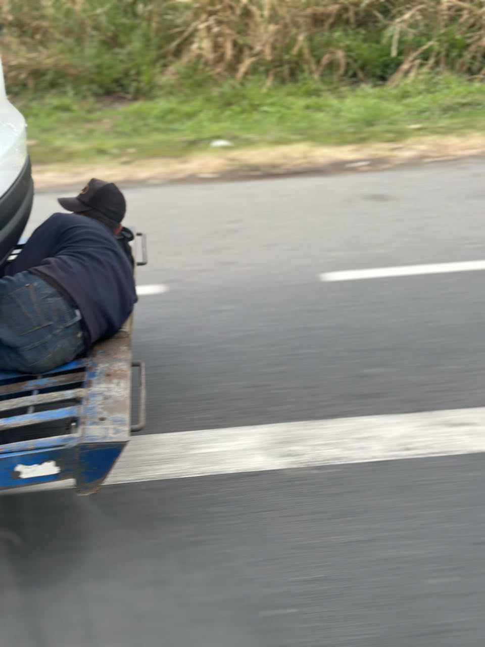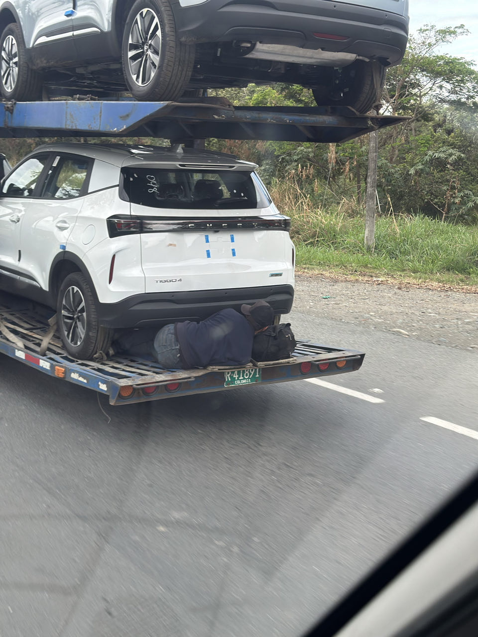 Parfois des surprises inquiétantes s’offraient à nous. Ici un passager clandestin profite d’un camion de transport de véhicules pour se faire transporter gratuitement.