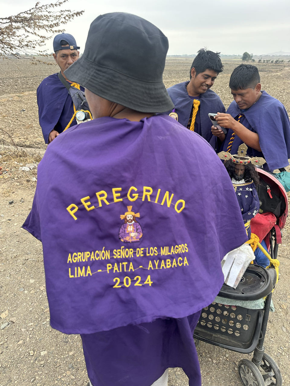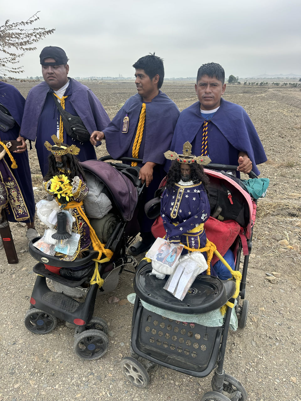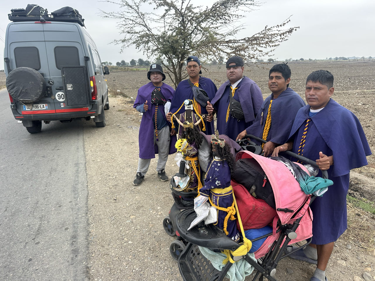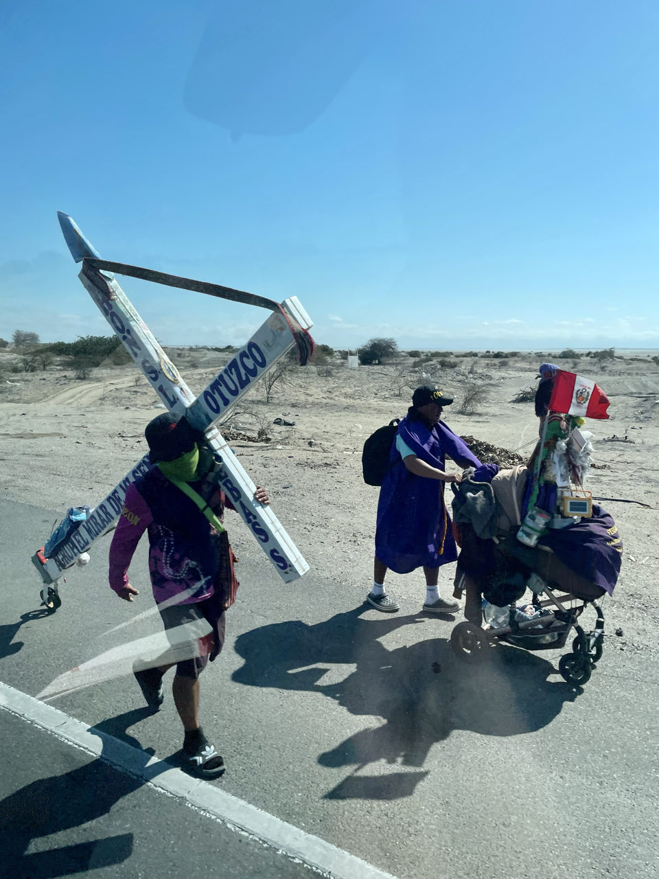 Sur la route de drôles de pèlerins qui portaient des croix et statues affrontaient la circulation intense de la panaméricaine.