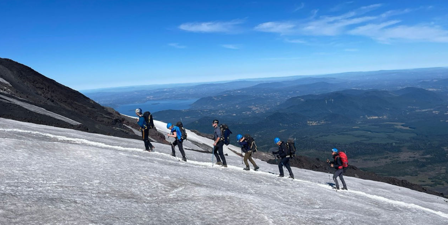 Nous nous étions fixés un nouvel objectif celui d’atteindre le sommet du Villarrica ( 2847 mètres ) Ce volcan est l’un des plus actifs d’Amérique du Sud, sa dernière éruption date seulement de 2015, toute la population de la ville de Pucon avait alors été évacuée. Autant le dire cette ascension a été spectaculaire mais très éprouvante, 1650 mètres de dénivelé et 5h30 de montée dans la neige et la lave solidifiée. Heureusement la descente fut beaucoup plus rapide puisque nous avons terminé en luge façon bobsleigh.