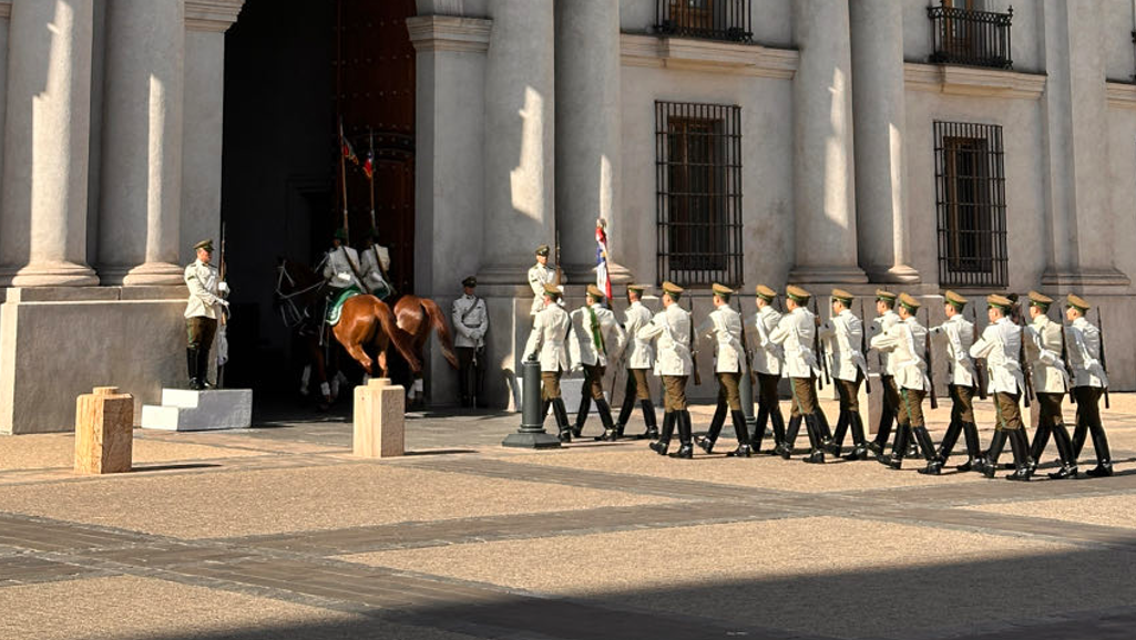 Visite du palais de la Moneda. Il s’agit du palais présidentiel tristement célèbre depuis le coup d’Etat du 11 septembre 1973. Ce jour là les forces armées chiliennes s’emparèrent du palais en le bombardement avec l’aviation militaire. Le Président en exercice, Salvador Allende, combattra contre les putschistes, il se suicidera avec son arme à l’issue des combats. Ces chaussures sont exposées dans le palais de même que l’endroit où son corps a été récupéré. Cet événement ouvrira une longue période de dictature avec à la tête du pays le sinistre Général Pinochet. Elle mettra le Chili sous la botte des militaires de 1973 à 1990. À l’issue de la visite, défilé militaire avec la relève de la garde.