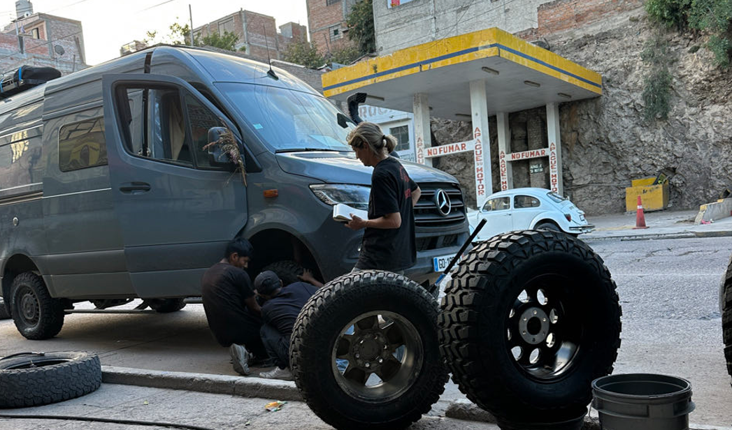 Nouvelle crevaison pour Ulysse mais cette fois c’est du sérieux, le pneu est complètement déchiré. Après réflexion et compte tenu que les pneus approchaient les 40.000 km nous décidons de les changer tous les quatre. C’est un peu tôt pour procéder à un changement total, mais compte tenu de l’intensité avec laquelle nous parcourons l’Amérique du Sud , nous n’avons voulu prendre aucun risque.