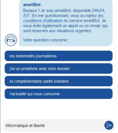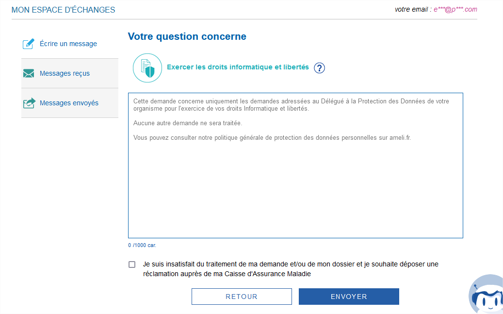 • Utiliser le chatbot (oui on ne peut accéder à l’envoi de message directement… Taper « Informatique et liberté »
