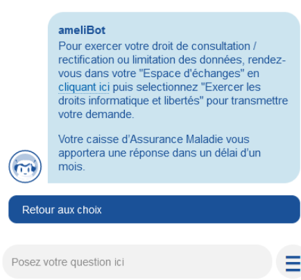 Cliquez dans le Chatbot sur « cliquant ici » une nouvelle page s’ouvre et aller dans exercer les droits informatique et libertés