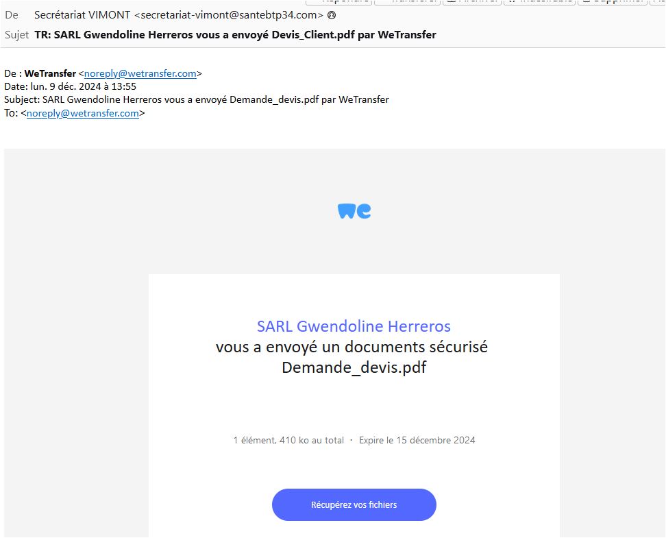 SARL Gwendoline Herreros vient d'envoyer une demande de devis par wetransfer sur mon adresse "poubelle", celle qui me permet de recevoir ma collection de mails FRAUDULEUX.