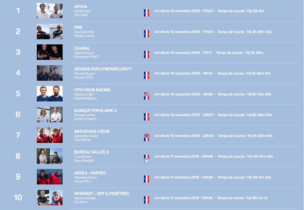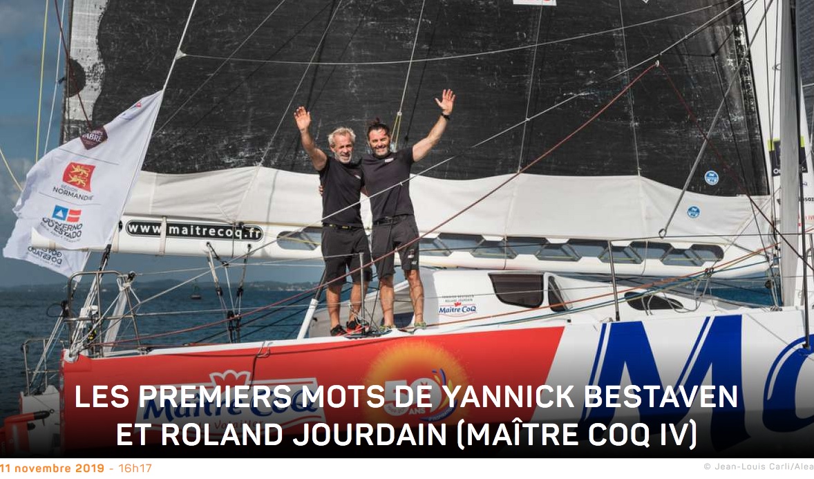 Ce lundi 11 novembre, à 11h 21mn 23s (heure française), Yannick Bestaven et Roland Jourdain ont franchi la ligne d’arrivée de la 14e édition de la Transat Jacques Vabre Normandie Le Havre en 11e position de la catégorie IMOCA. Le duo aura mis 14 jours 22h 06mn et 23s pour parcourir les 4 350 milles théoriques depuis Le Havre à la vitesse moyenne de 12,15 nœuds, mais il a réellement parcouru 4914 milles à 13,72 nœuds. Son écart au premier Apivia est de 1h 9h 58mn 23s.