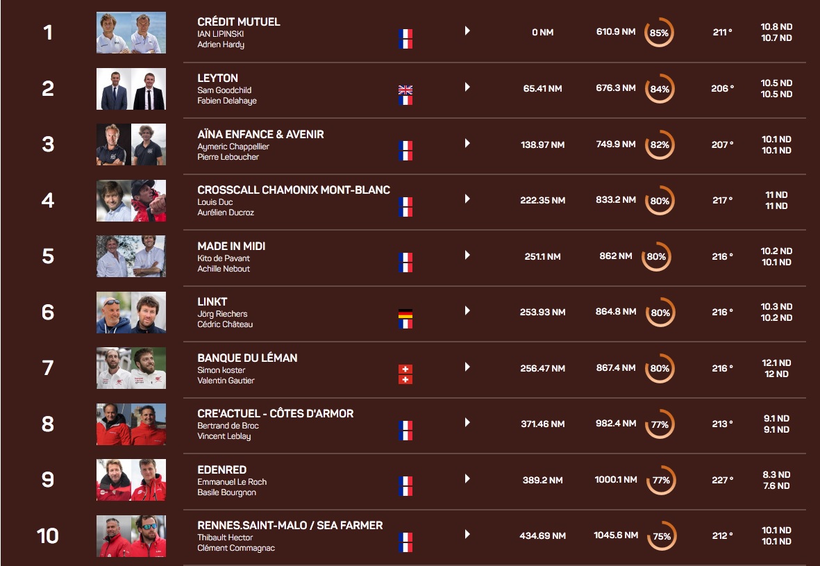 Au pied du podium virtuel, une belle bagarre se joue toujours entre quatre bateaux : Crosscall Chamonix Mont Blanc, Made in Midi, Linkt et Banque du Léman se tiennent en moins de 40 milles avec plus de 70 milles de décalage latéral, une donnée capitale, surtout si le vent n’adonne que peu sur la fin du parcours.