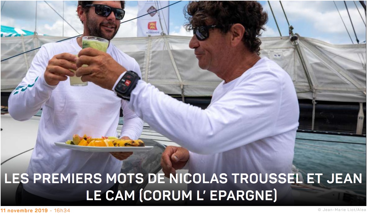 Fabrice Amedeo : (A propos de la bosse qu’il a sur le front) : ce n’est pas grand-chose, sur le dernier virement de bord je me suis cogné, la fatigue, les lumières, tout ça ! On a perdu sur ce dernier bord, parce qu’en fait on a déchiré notre grand gennaker au Cap Vert, et du coup on a subi une stratégie qui nous a décalés loin des côtes, nous étions avec notre petit gennaker. On est un peu frustré ! Nous sommes super contents parce que 10eme c’est super, parce qu’il y a quand même des grands noms de la course au large derrière nous. Il fallait cocher deux cases, option sud, et est dans le Pot-au-noir. On a coché les deux. C’était une belle transat !