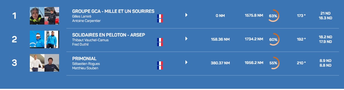 Primonial est reparti à 2 h 30 cette nuit de Mindelo (Cap Vert) où il a changé son démarreur (il ne pouvait plus produire d’électricité avec son moteur). L’infortuné tandem Rogues-Souben a donc 344 milles de retard sur ses deux concurrents qui continuent leur cavalcade dans l’alizé. A ce jeu, GCA Mille et un sourires détient manifestement un plus en vitesse et l’écart avec son poursuivant Solidaires en Peloton ARSEP continue de se creuser au fil des classements. Il culmine à 155 milles ce matin. Rien n’est gagné à l’entrée du Pot-au-noir que Gilles Lamiré et Antoine Carpentier atteindront ce soir. Mais force est de reconnaître qu’ils ont le contrôle de la situation avec leur concurrent pile dans l’axe, à une demi-journée de mer derrière eux. « Ils ont un très bon timing dans les bascules reconnaissait ce matin Thibaut Vauchel Camus. Et ils vont vite ! On a le sentiment de se bagarrer derrière et c’est un peu frustrant. A bord, pour nous tout va bien, on n’a rien cassé mais on n’a quasiment jamais trouvé la même force et le même angle de vent qu’eux, c’est tout »