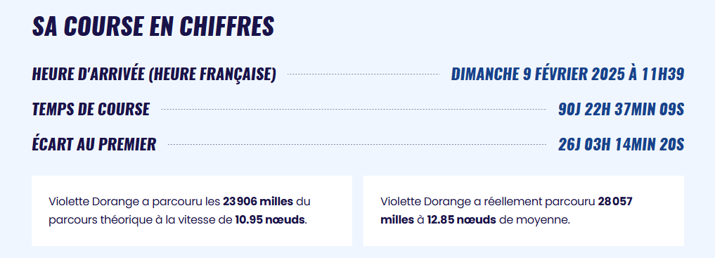 - 9 février 2025 Arrivée de Violette en 25e position, après 90 jours en mer.