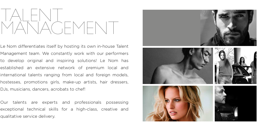 Le Nom differentiates itself by hosting its own in-house Talent Management team. We constantly work with our performers to develop original and inspiring solutions! Le Nom has established an extensive network of premium local and international talents ranging from local and foreign models, hostesses, promotions girls, make-up artists, hair dressers, DJs, musicians, dancers, acrobats to chef!