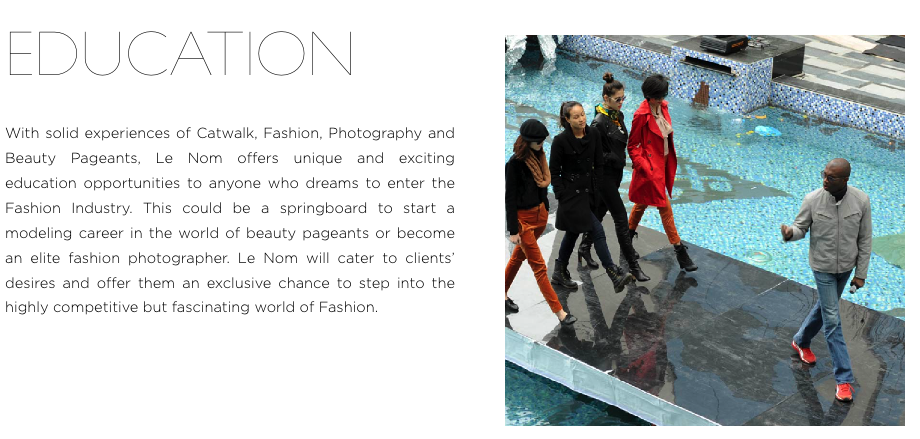 With solid experiences of Catwalk, Fashion, Photography and Beauty Pageants, Le Nom offers unique and exciting education opportunities to anyone who dreams to enter the Fashion Industry. This could be a springboard to start a modeling career in the world of beauty pageants or become an elite fashion photographer. Le Nom will cater to clients’ desires and offer them an exclusive chance to step into the highly competitive but fascinating world of Fashion.