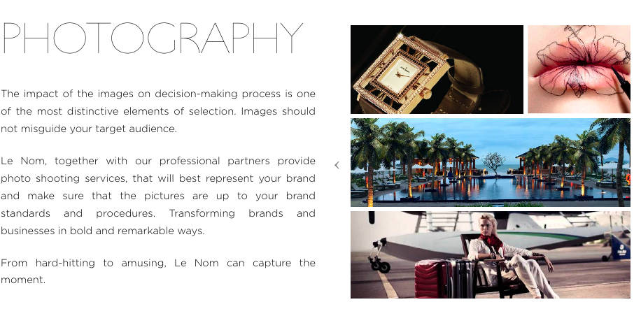 Le Nom, together with our professional partners provide photo shooting services, that will best represent your brand and make sure that the pictures are up to your brand standards and procedures. Transforming brands and businesses in bold and remarkable ways.