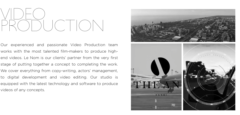 Our experienced and passionate Video Production team works with the most talented film-makers to produce high-end videos. Le Nom is our clients’ partner from the very first stage of putting together a concept to completing the work. We cover everything from copy-writing, actors’ management, to digital development and video editing. Our studio is equipped with the latest technology and software to produce videos of any concepts.