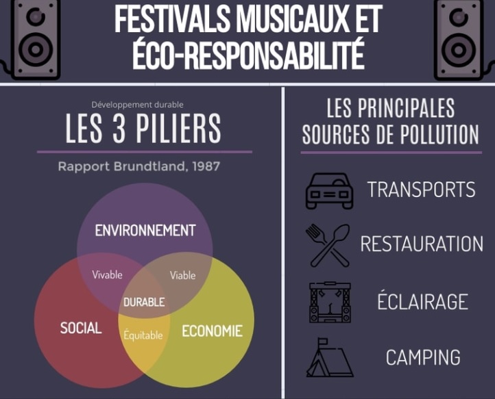 Parce que l’environnement est un enjeu global, les festivals ne sont pas épargnés par cette problématique et nombreuses sont les actions entretenues par les acteurs, locaux et internationaux, pour réduire leur empreinte négative sur la planète. Mais de quoi parle-t-on lorsque l’on évoque un festival éco-responsable ? Si l’on se base sur la définition officielle de 1987, le développement durable est fondé sur trois piliers : la responsabilité environnementale, sociale et économique.