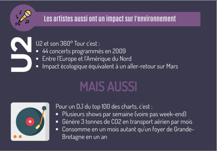 Enfin, troisième et dernier acteur qu’on aurait tendance à oublier : les artistes eux-mêmes. Ils sont acteurs de leur scène musicale et ont eux aussi un impact environnemental. Par exemple, un groupe populaire comme U2, pourtant reconnu pour ses actions environnementales, qui organise une tournée de 44 dates va autant polluer qu’un aller-retour sur Mars ! Les plus grands DJs qui occupent la tête des classements et sont programmés dans de nombreux clubs vont, chacun d’entre eux, autant polluer en un mois qu’un habitant de Grande-Bretagne en un an.