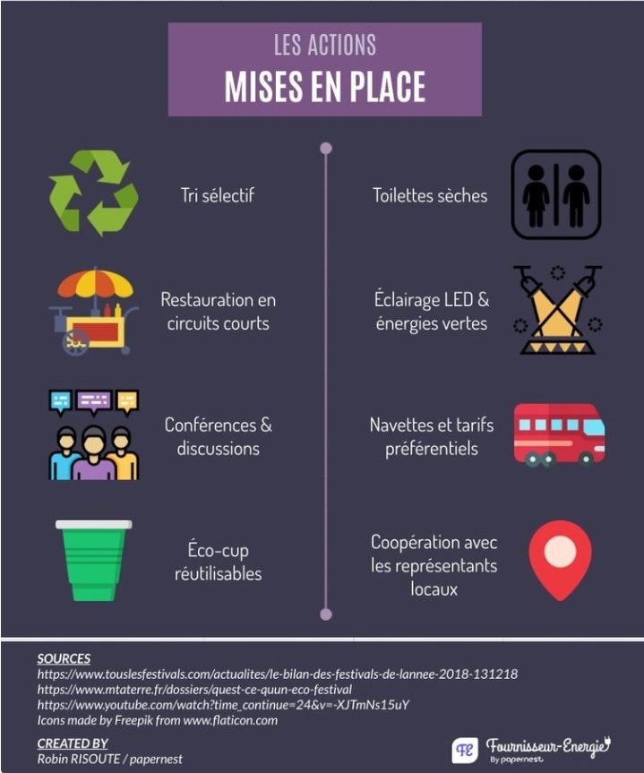 Finalement, outre cette liste non-exhaustive d’actions pouvant être mises en place, ce qui peut aider à obtenir un résultat sur le long-terme, c’est la sensibilisation et la coopération entre les organisateurs des différents festivals. Chacun d’entre eux peut favoriser les circuits courts pour développer l’économie locale et réduire la masse des transports (surtout concernant l’acheminement des produits sur le site). Cette démarche peut être rendue possible en multipliant les acteurs impliqués dans l’organisation d’un festival.