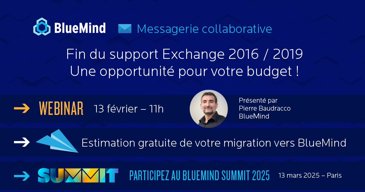 Pour en savoir plus, BlueMind propose un webinar, une estimation gratuite de migration et une invitation au BlueMind Summit pour échanger avec experts et partenaires.