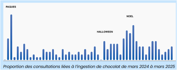 D’après les données du 3115 – Urgences vétérinaires, les pics d’appels liés à l’ingestion de chocolat sont observés à trois périodes clés : Pâques, Halloween et Noël.