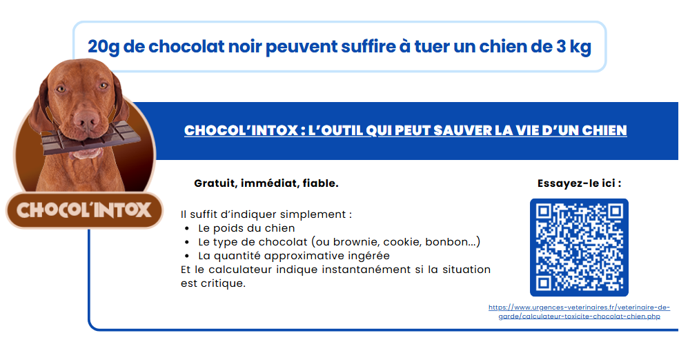 A savoir : Un chien qui a ingéré du chocolat peut mettre plusieurs heures avant de présenter des symptômes. La théobromine agit de façon retardée, ce qui rend l’intoxication d’autant plus insidieuse. Si vous avez un doute, utilisez le calculateur ou appelez immédiatement un vétérinaire