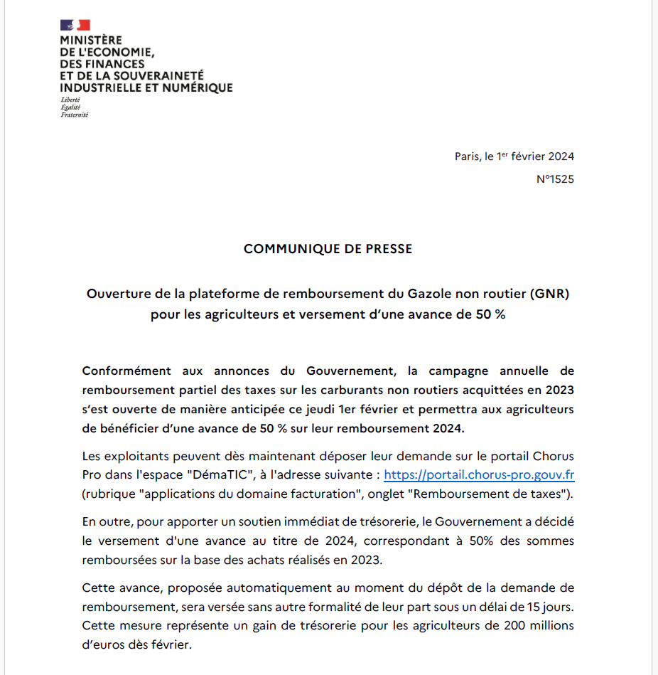 L'une des premières mesures promises par le Premier Ministre Gabriel ATTAL mise en application très rapidement, il faut le reconnaitre. Cette mesure correspond au remboursement des taxes sur le GNR (Gazole Non Routier).