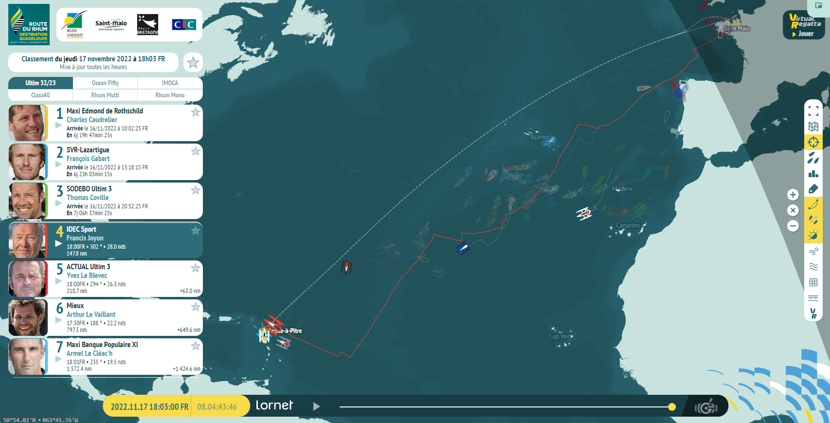 Pour ceux de l’arrière aussi, notamment ceux qui comptent parmi les partisans d’une route Sud, la course prend aussi une toute autre tournure. Stan Thuret (Everial) qui progresse à 175 milles dans le Nord-Ouest des Canaries plante le décor : « Je suis d’attaque pour attaquer le spi. Côté stratégie, je joue mon option. J’ai fait un choix il y a quelques jours et je préfère ne pas revenir en arrière. Dans quelques heures, je devrais commencer à bien glisser. Les autres seront plus rapides, mais la route est encore longue. Mais mon bateau est vraiment taillé pour le portant, c’est l’un des plus rapides à cette allure ; et j’espère me refaire un petit peu. » Pour tous, c’est le souffle de l’espoir de naviguer vers des jours meilleurs qui l’emporte ce jeudi. Un sentiment que Keni Piperol (Cap’tain Alternance) partagera bientôt. Le jeune Guadeloupéen, en escale technique pour réparer une voie d’eau, s’apprête à quitter les côtes espagnoles. La Corogne, c’est le port qu’ont rejoint depuis peu Amélie Grassi (La Boulangère Bio) et Aurélien Ducroz (Crosscall), tous deux victimes d’un démâtage le week-end dernier. Aujourd’hui, ils ont reçu le soutien de Mickael Mergui (Centrakor), lui-même en escale dans le port galicien, qui n’a pas hésité à venir à leur rencontre pour leur apporter du gasoil. Preuve que la solidarité entre marins solitaires reste une inoxydable valeur, sur les quais des ports et les routes jalonnant la grande traversée entre Saint-Malo et Pointe-à-Pitre…