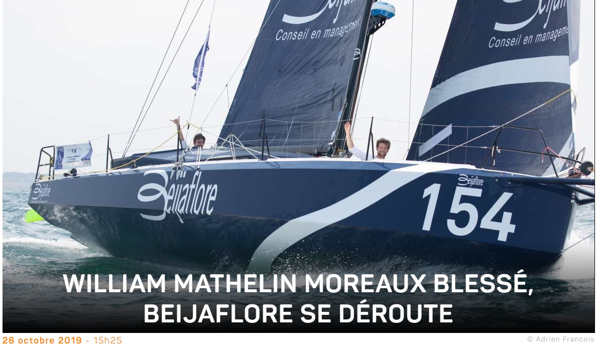 William Mathelin Moreaux blessé, le Class40 Beijaflore se déroute. Marc Guillemot et William ont contacté leur équipe à terre à 14h15 pour les prévenir que le jeune skipper s’est blessé à l’épaule à bord du Class40 Beijaflore. Le bateau fait actuellement route vers le port le plus proche, où il sera pris en charge.