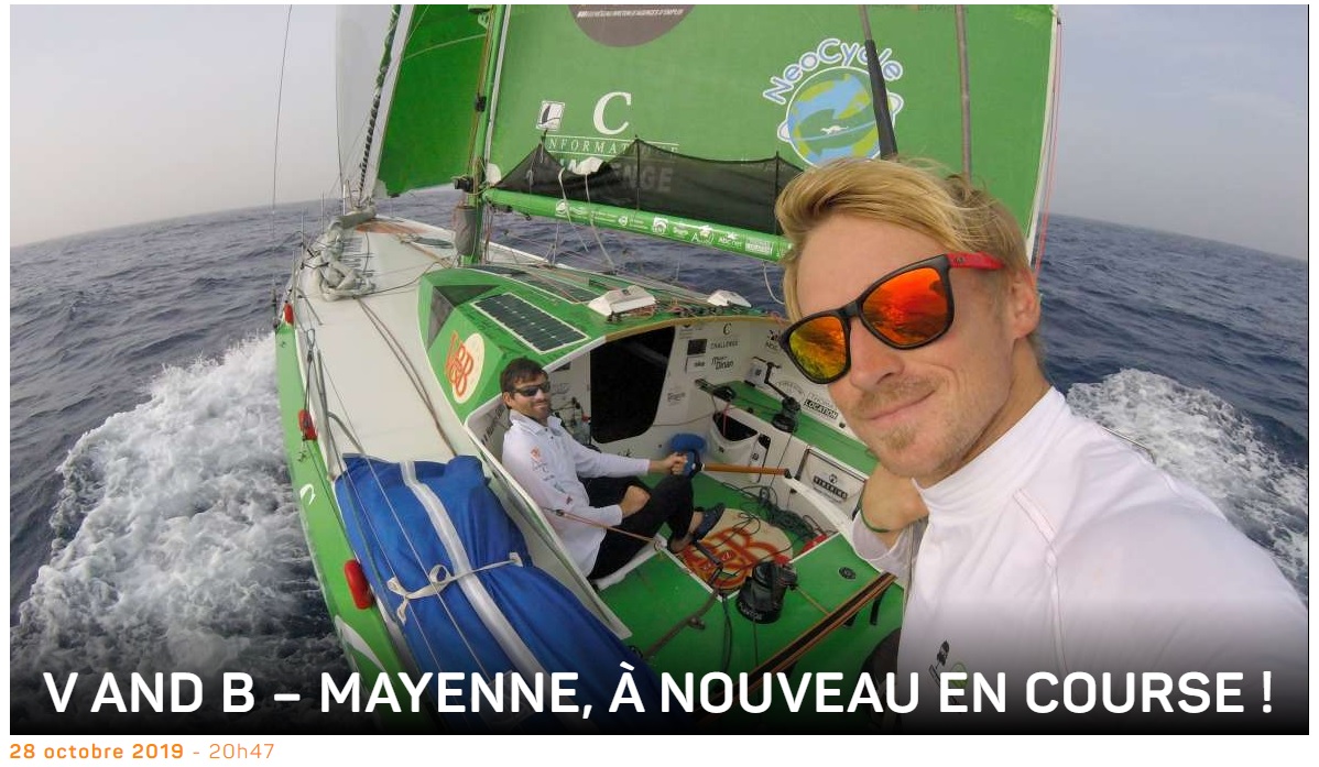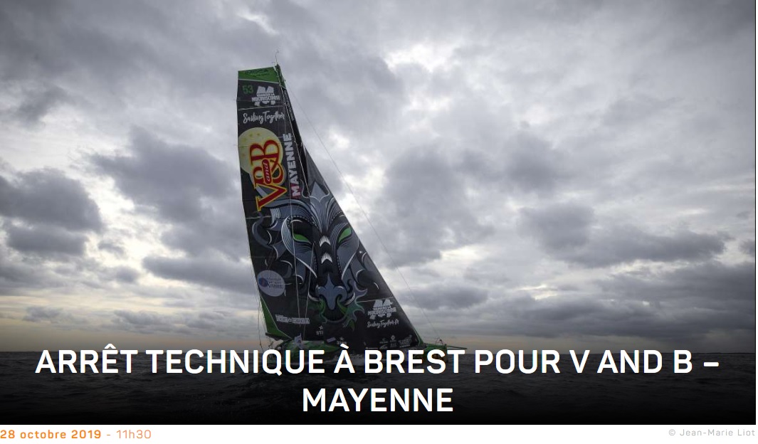 Après 5 heures d'arrêt technique à Brest, Maxime Sorel et Guillaume Le Brec sont repartis ! Les préparateurs ont travaillé d'arrache- pied et remplacé le tirant d'outrigger bâbord qui était endommagé. V and B – Mayenne est à nouveau prêt pour sa Transat Jacques Vabre Normandie Le Havre. Le duo va entrer dans une nouvelle course et tenter de grappiller des places au fur et à mesure de sa progression vers Salvador de Bahia. Le vent a basculé au Sud et il est moins puissant que depuis le départ de la Route du Café. Place à la traversée du golfe de Gascogne. « Mon équipe a été géniale. Nous repartons dans de bonnes conditions. Je tiens ici à remercier le Team Actual Leader, Highfield, le Team Sodebo, Blewstub et Jean-Philippe JOLY qui nous ont aidé à Brest. Je souhaite bon vent aux équipages de la Brest Atlantiques. Merci également à mes partenaires pour leur soutien sans faille. Nous repartons de Brest à 100%. » déclare Maxime.
