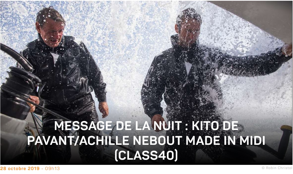 Après un très bon départ qui les plaçait en tête à Etretat, Kito de Pavant et Achille Nebout n’ont rien pu faire face aux derniers protos. « Sous spi Made in Midi n'a pas la vitesse des bateaux recents et nous n'avons que regressé au classement. Pas tres encourageant pour la suite !!! » soulignait Kito dans son message du matin.