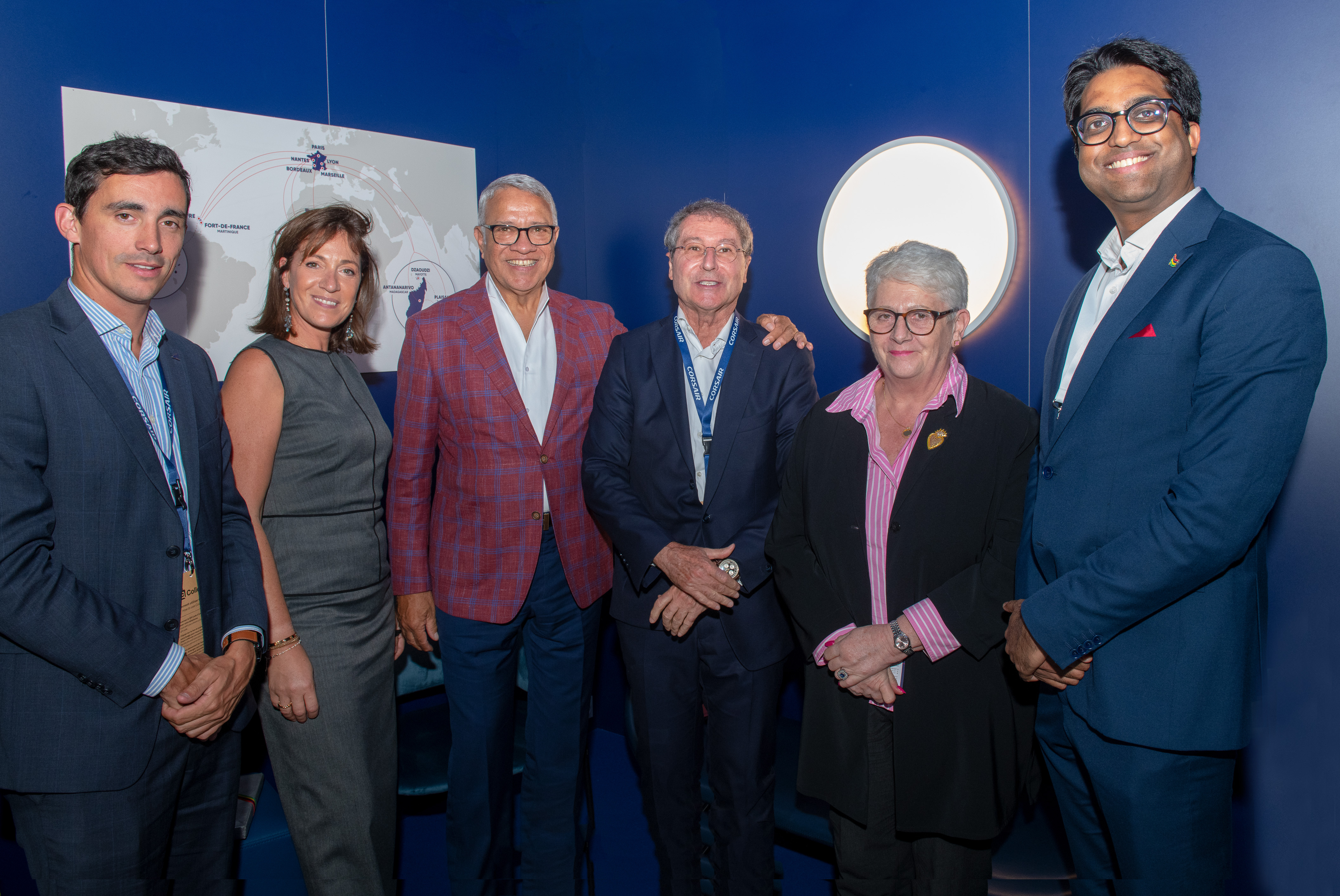 Jules Perreau, directeur régional Océan Indien Corsair, Karen Levy, directrice Expérience Client et Communication, Philippe Hitié, dit Popo, représentant la compagnie aérienne à Maurice,  Pascal de Izaguirre, PDG de Corsair, Claire Le Lay et Avinash Teelock, présidente et directeur de la Mauritius Tourism Promotion Authority (MTPA). Crédit photo © Horizon Océan Indien / Joey Nicles Modeste.