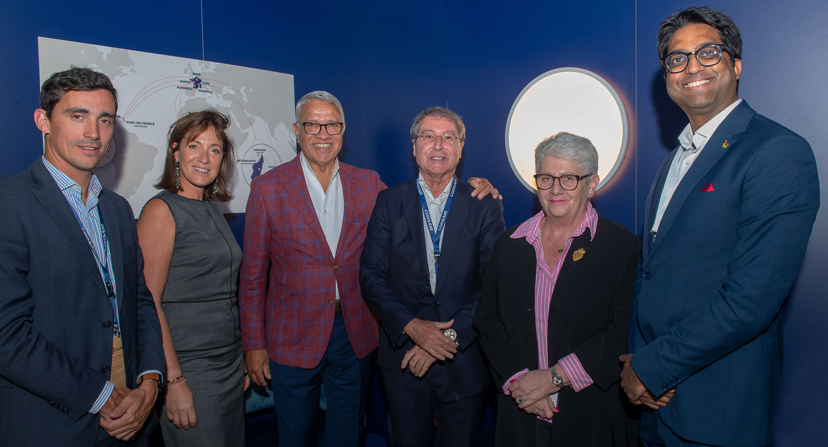 Jules Perreau, Directeur Régional Océan Indien chez Corsair International, Karen Levy, Directrice Expérience Client et Communication, Philippe Ithier, dit Popo, représentant de la compagnie aérienne à Maurice, Pascal de Izaguirre, le PDG de Corsair , Claire Le Lay, présidente de la Mauritius Tourism Promotion Authority (MTPA), Avinash Teelock, directeur de la MTPA