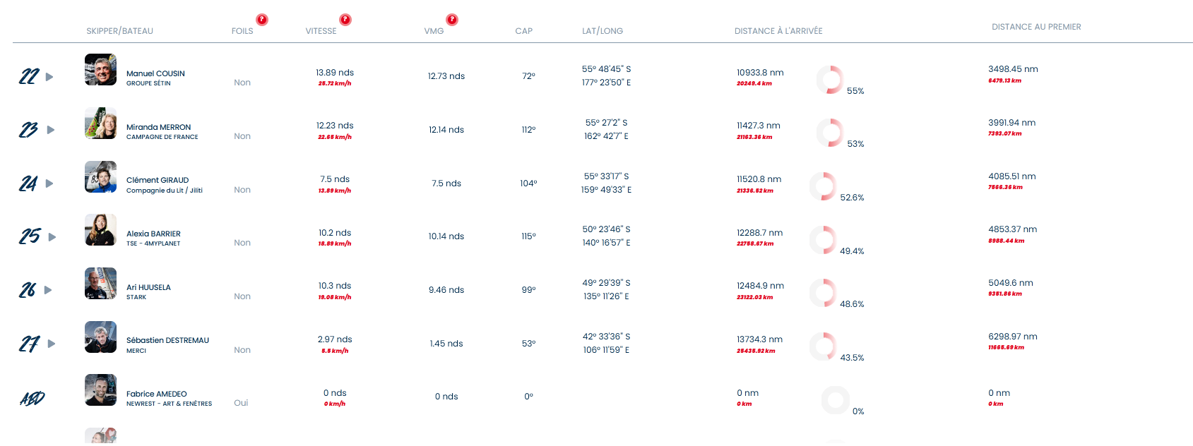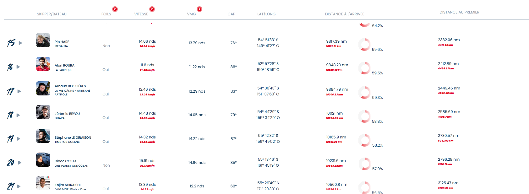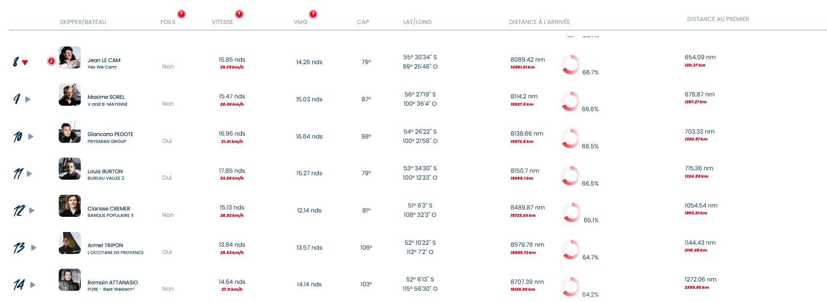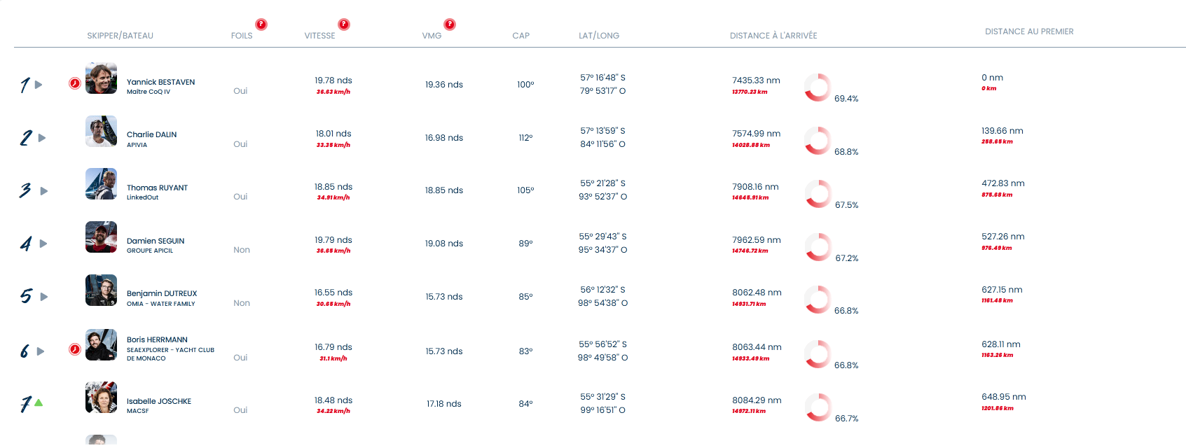 En ce premier jour de janvier, l’escouade des poursuivants emmenée par Ruyant navigue à l’arrière de la dépression, dans un flux de Sud-Ouest qui permet à tous d’accélérer. Si le vent est glacial, c’est toujours très chaud dans les rangs : Isabelle Joschke (8e) est à 3 milles, pile dans l’axe de Yes WeCam (7e) ! Il faut donc « s’arracher » pour gagner le moindre mètre, comme s’emploient à le faire Benjamin Dutreux (5e) ou Louis Burton (11e). Même si l’exercice a quelque chose d’épuisant, ils se sont tous pris au jeu de cette régate planétaire.