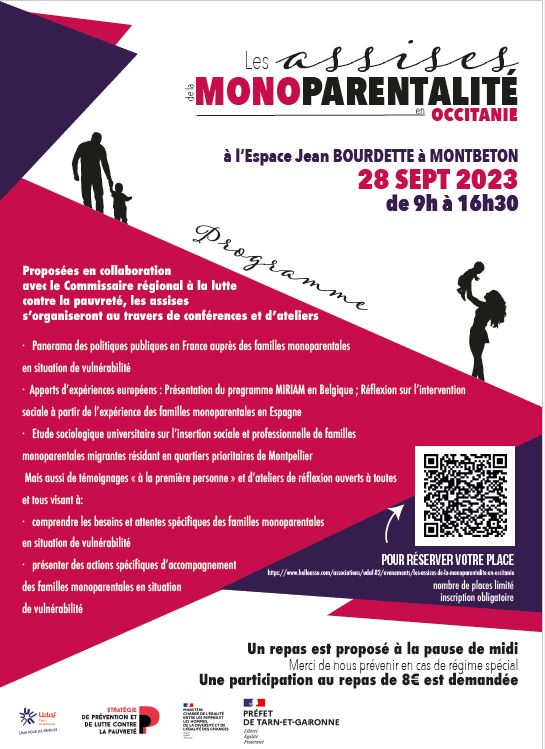 Les places sont limitées, la réservation est obligatoire pour participer à la journée. Vous pouvez vous inscrire via le site: https://www.helloasso.com/associations/udaf-82/evenements/les-assises-de-la-monoparentalite-en-occitanie ou avec le QR code sur le visuel. La participation de 8€  pour le repas est prise en charge par l'UDAF.