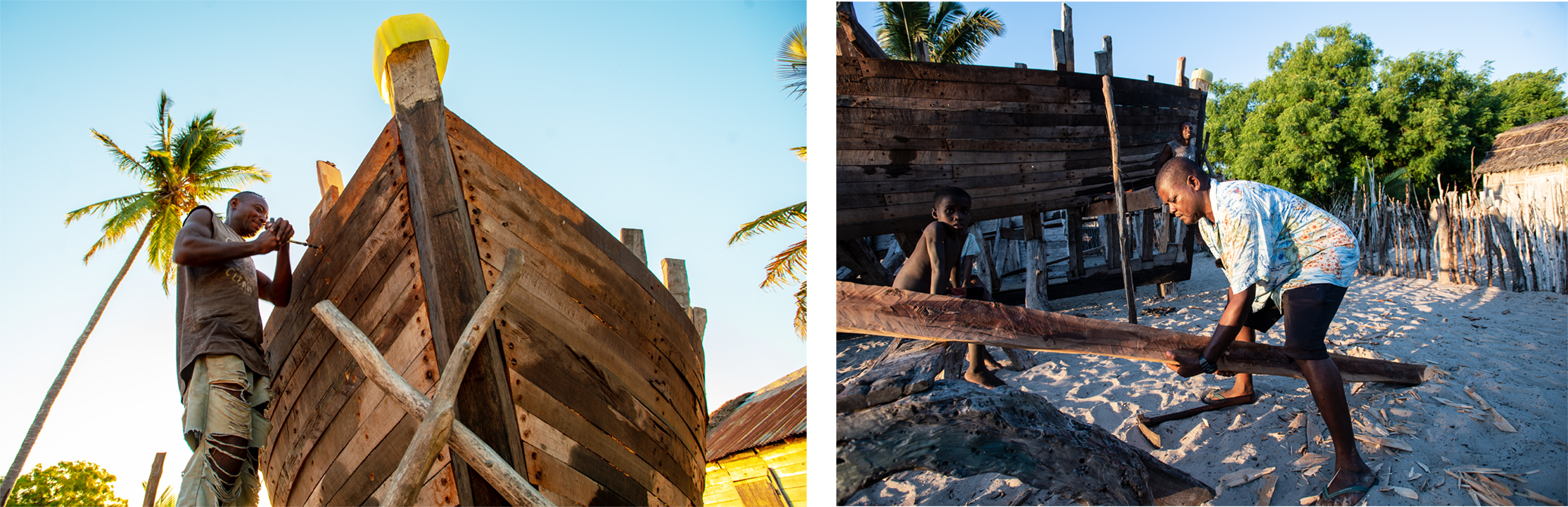 Boutres servant tout à la fois aux transports et à la pêche. Étonnant ces boutres en bois sont fabriqués sans aucun plan, dessinés à l'avance et construits avec des bois sélectionnés pour leur forme directement dans la forêt. Des constructions réalisées au jour le jour au gré des possibilités financières de chaque charpentier constructeur. A Madagascar, comme dans beaucoup de domaines, le savoir-faire traditionnel se transmet de génération en génération et s'exerce depuis l'enfance.