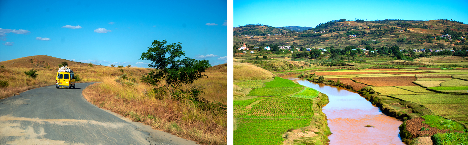 Madagascar ressemble ainsi, à la fois à l'Afrique et l'Asie. A l'Asie d'abord avec ces rizières, à perte de vue, gorgées d'eau. Rizières qui servent de réserve à poissons que l'on tente de cerner avec de petits filets. Ressemblance avec Afrique avec la savane, les pistes sableuses, les arbres clairsemées, les cases en branchages, les rues animées et bruyantes de chaque village. Toutefois entre ces deux visions, on change de décor sur les hauts plateaux. Le climat se fait plus accueillant et ce sont de véritables vergers, plantations de carottes, de pommes de terre, de fruits que l'on croise. Puis de nouveau la sécheresse rend la nature rude, dépouillée, ne laissant apparaître que des broussailles accrochées à une terre rouge hostile. La déforestation a rendu les collines dénudées et ocres.