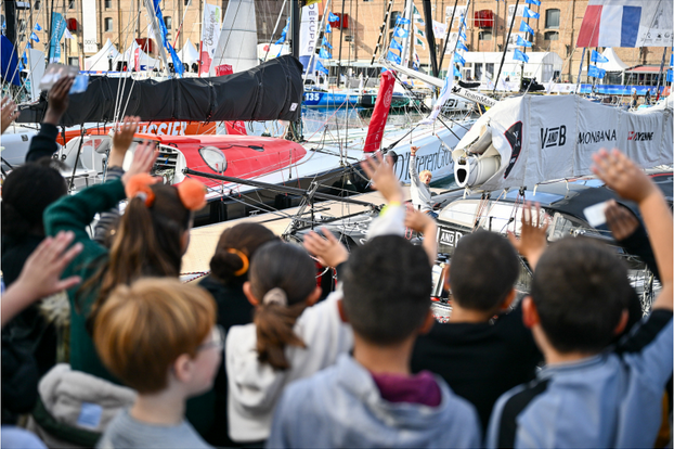 Venus de toute la Normandie, certains découvrent la course : « ils sont drôlement forts d’aller jusqu’en Martinique en bateau ! ». L’insouciance de l’enfance a séduit aussi les marins, ravis de revenir aux basiques à travers leurs regards et leurs mots. Car pour la première fois, la ville du Havre organisait une rencontre à grande échelle entre 16 classes primaires de l’agglomération du Havre et des skippers de toutes les classes. Dans une des salles du cinéma Pathé sur les Docks, des dizaines de petites mains se lèvent, pressées de poser leur questions, parfois sans filtres... « Vous avez déjà pleuré en mer ? » demande sans ciller Saïna ! « Oui, beaucoup, quand j’ai perdu ma quille lors d’une course» reconnaît Nick Moloney (BE WATER POSITIVE). Des moments qui se sont prolongés sur les pontons avec séance d'autographes, apprentissage des nœuds marins et découverte de la voile sur l’eau. Sur 223 baptêmes effectués aujourd’hui, 118 étaient des élèves qui n’avaient jamais fait de voile pour la plupart, comme un avant-goût des vacances !