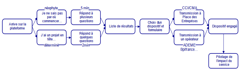La version bêta de la plateforme, construite et testée auprès d’une trentaine d’entreprises, propose aujourd’hui une orientation vers les aides et dispositifs ; dans un second temps elle proposera aussi des actions, personnalisées en fonction de son secteur d’activité. L'entreprise n’aura plus à saisir à nouveau toutes ses informations auprès des opérateurs au moment de déposer sa demande. Opérateurs et acteurs publics travaillent en lien étroit pour proposer la plateforme la plus complète et fluide possible.