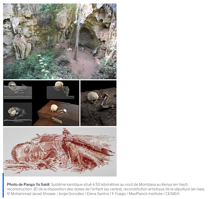 Dans le site de Panga Ya Saidi, situé au nord de Mombasa, au Kenya, le corps d’un enfant de trois ans, baptisé par les chercheurs « Mtoto » (enfant en Swahili), a été déposé et enfoui à l’intérieur d’une fosse volontairement creusée. En analysant les sédiments et la disposition des ossements, les chercheurs ont mis en évidence que le cadavre a été protégé en l’enveloppant dans un linceul en matière périssable et que sa tête devait aussi reposer sur un support périssable. Malgré l’absence d’offrande et d’ocre, pourtant communs dans des sépultures plus récentes, ce traitement plaide en faveur d'un rituel complexe, qui a probablement demandé la participation active de plusieurs membres de la communauté. L’individu appartient à notre espèce mais garde dans sa morphologie dentaire, par comparaison avec des restes humains de la même époque, quelques traits archaïques le reliant à de lointains ancêtres africains. Cela semble confirmer, comme il a été suggéré à plusieurs reprises au cours des dernières années, que l’origine de notre espèce en Afrique a des racines anciennes et régionalement diversifiées.