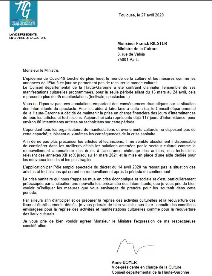 Covid-19 Anne Boyer, vice-présidente en charge de la Culture, écrit au ministre de la Culture pour l’alerter sur les "conséquences dramatiques" de cette crise sur les intermittents du spectacle @HauteGaronne @AnneBOYER31